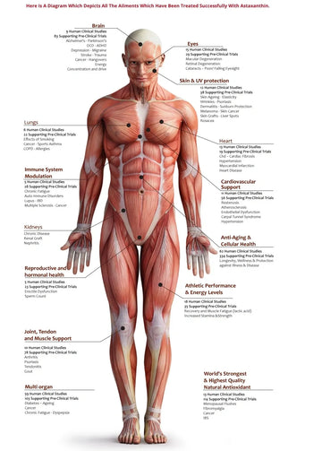 In studies & trials, Astaxanthin has been proven to slow cognitive decline from brain aging, protects brain cells, prevents brain swelling after head injury through its anti inflammatory properties, so great for contact sports. It protects brain cells from damage from toxins, good for drug and alcohol abuse. Prevents oxidative damage from drops in blood supply and oxygen to the brain. Improve mental performance after stroke.